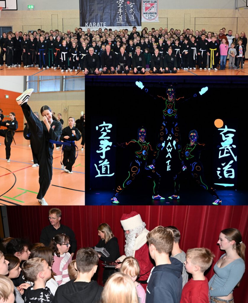 Das ganze Jahr haben wir uns wieder darauf gefreut. Die Organisation lag wie immer in den Händen von Thorsten Lehmann und Team. Lehrgangsleiter Helmut Stadelmann und Prüferin Sabrina Hofmann mit Team, absolvierten mit den angereisten Teilnehmern einen ausgefüllten und sehr anstrengenden Tag. Kihon, Kata, Kumite und Goshin waren angesagt. (In unserer Sprache Grundschule, Formenlehre, Kampf und Selbstverteidigung). Da wir viele ausländische Mitbürger bei uns haben, ist die Karate Verständigung in japanisch. Somit weiß jeder, nach kurzer Zeit was gemeint ist. Zusätzlich haben wir an den Wänden und Decken großformatige Infofahnen angebracht um es unseren Neumitgliedern leichter zu machen. Unser Thorsten hatte diese sehr gute Idee. Nach dem Mittagessen begannen die für alle erfolgreichen Prüfungen, die sich bis in den Abend hinzogen. Nach einem leckeren Abendessen, zubereitet von unserem Grill- und Buffettteam begannen mit dem Nikolaus, der Bescherung, einem 20- Jahresrückblick und einer Blacklightshow unsere Veranstaltungen. Es war ein schöner Karatetag der spät zu Ende ging.